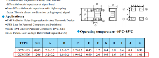 谷景對(duì)應(yīng)GCMH06系列貼片共模電感的參數(shù):90Ω的阻抗、370mA的額定電流、0.3Ω的直流電阻。