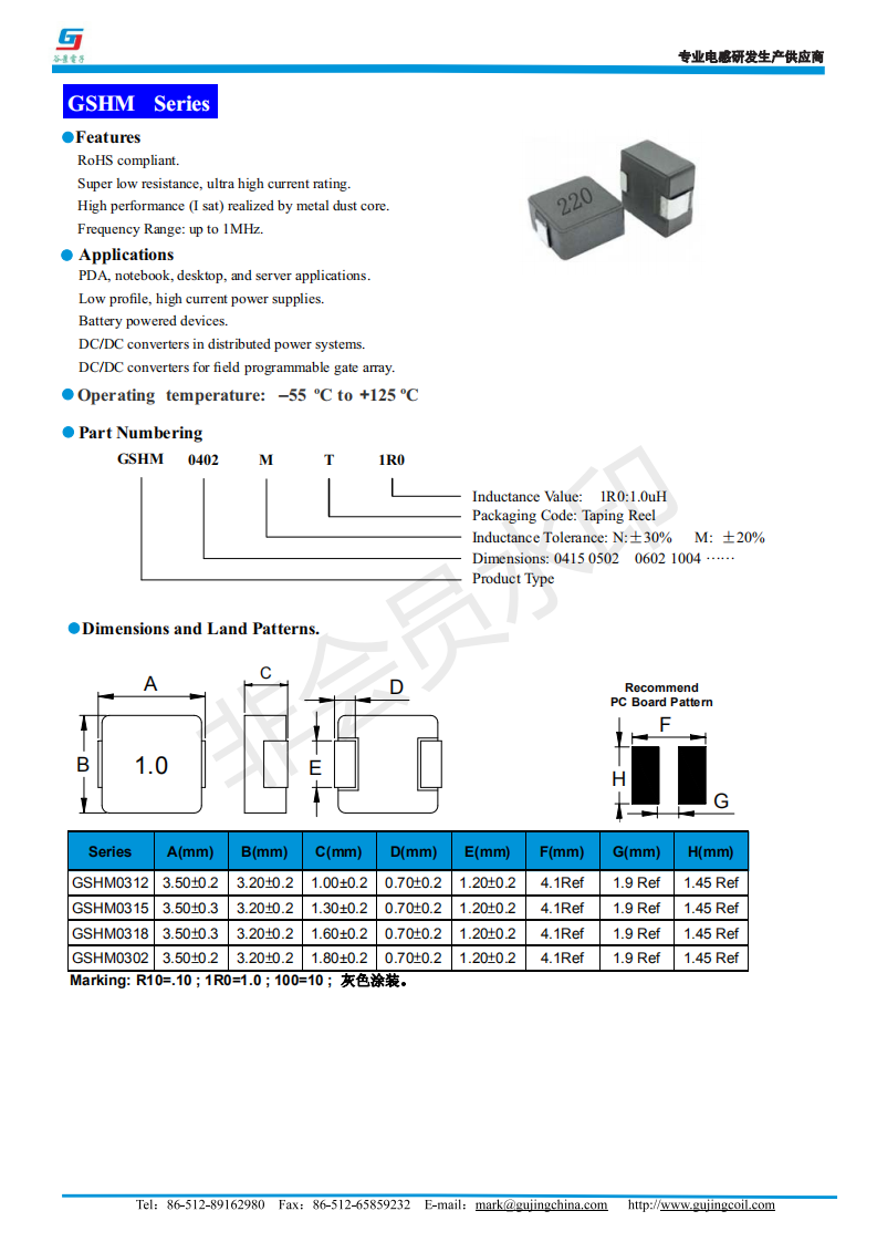 谷景GSHM一體成型電感的型號(hào)有:03系列尺寸為3.5*3.2*1.8、04系列尺寸為4.45*4.06*1.8、05系列尺寸為:5.70*5.20*2.80、06系列的尺寸為:7.30*6.60*4.8、10系列的尺寸為11*10*4.8、12系列的尺寸為:13.5*12.5*6.2。尺寸齊全,適合各種不同的電路。