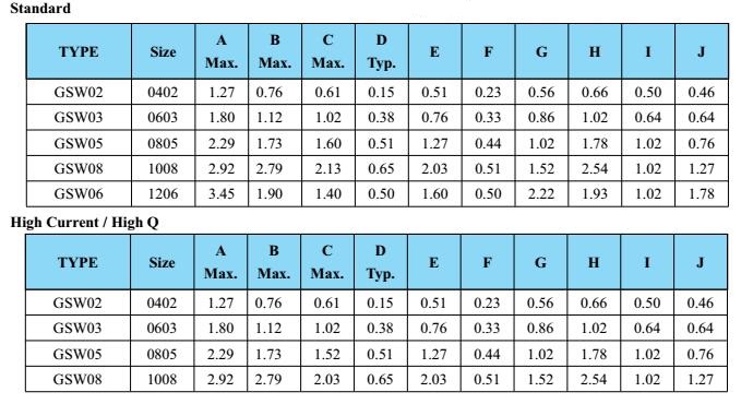 四、高頻繞線電感器封裝尺寸列表 (UNIT:mm)